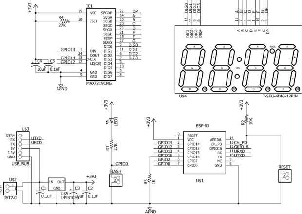 Por lo que yo planeaba usar la ESP8266, específicamente, el ESP-03 como el cerebro del reloj. Decidí utilizar a cuatro dígitos, display de siete segmentos. Para manejar la pantalla, yo usaría un IC de 7219 MAX. Vea la foto.