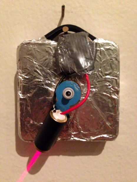 Montar el reloj.  Instale el láser a la manecilla de las horas con pegamento o cinta.  He añadido una batería de reloj como fuente de alimentación para el láser, pero idealmente funcionaría de la misma fuente de energía como el reloj.  Opté por usar sólo una mano de la hora porque me gustó la sencillez de un solo "brazo del."  También, puede Agregar un láser separado a la manecilla de los minutos si quieres.  Sólo mantenía simple.