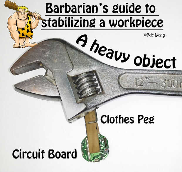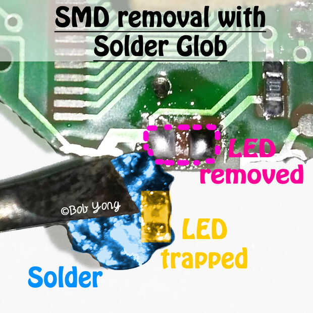 Derretir un pegote de soldadura en la punta - lo suficientemente grande como para encajonar el LED todo. Bajo la globalización de la soldadura sobre el LED asegurándose de que la globalización está en contacto con el ánodo y el cátodo del LED SMD. Cuando está seguro de que la Junta de soldadura fundidos (aproximadamente 2 segundos), quitar el pegote de soldadura lejos con las pinzas. El LED debe ser encajonado en la soldadura glob(see pictures)