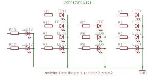 el LED adecuado para Arduino pin diagrama a continuación, recuerde it´s al revés, en lugar de todos a la tierra, todos a 5V, etc..