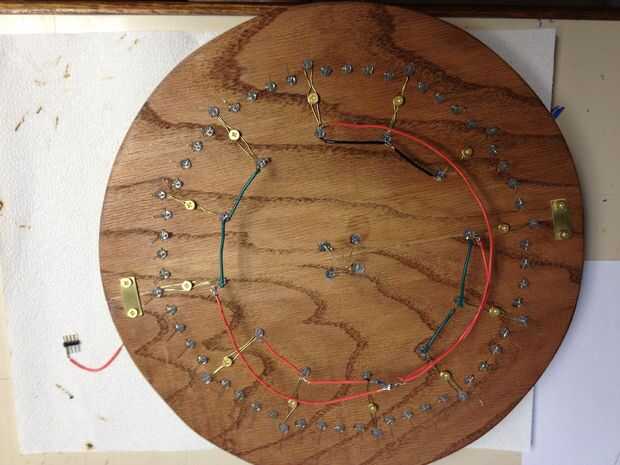 Las dos últimas imágenes están cercanas ups del reloj que esperemos que muestran cómo se enhebra el alambre a través de los tubos. Difícil ser visto desde el frente, pero hay un agujero en la madera donde se encuentra cada tubo que el cable se enrosca hacia abajo en, y luego se añade un LED para que el alambre no se tiró a través otra vez. Hay fotos de arriba y voy a entrar en más detalle más adelante.