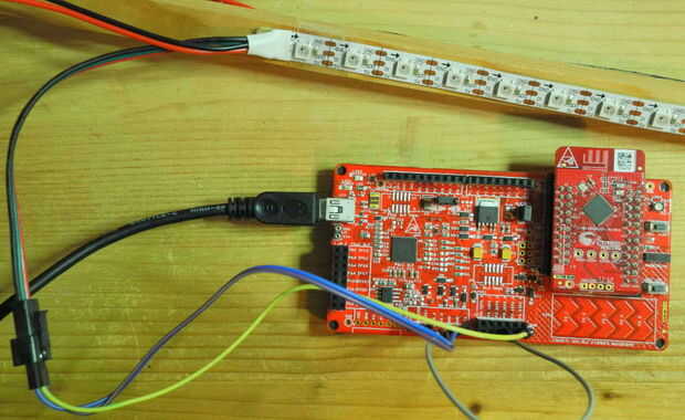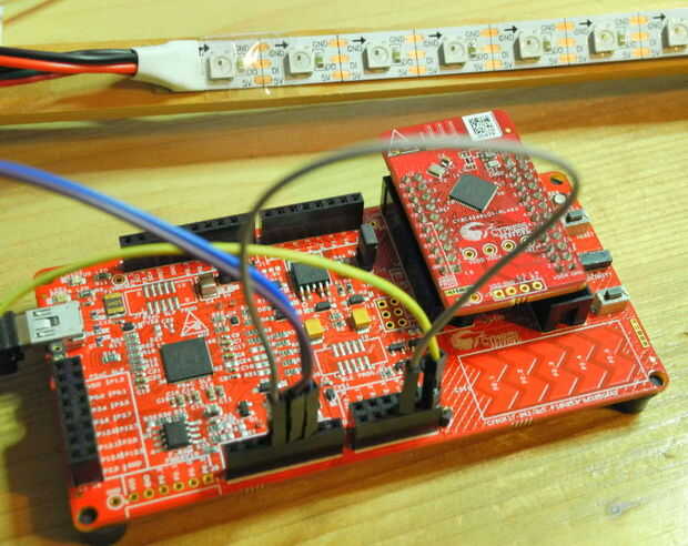 Depuración-tira del LED es alimentada desde el mismo tablero dev. Porque solo tres LEDs son conducidas a la vez, la fuente de USB es suficiente. Para corrientes más altas en coche debe pensar en alimentar los LED. Sólo tiene que conectar el GND al kit de desarrollo para proporcionar una referencia común.