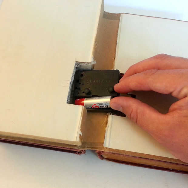 ![]() | Que había dejado a un lado del centro de libro sin pegar así fue capaz de abrir mi libro y Inserte la batería en el reloj. Por último las manos para mi reloj parecido insignificante, así que corte nuevos de cartón, pintaron blanco de alto contraste, luego pega las manos nuevas en la parte superior los antiguos. Las agujas del reloj entonces se instalaron en la carátula del reloj y el tiempo fue establecido. |
