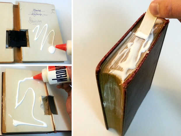 Cada libro final fue pegado totalmente cerrado, su superficie exterior rugosa con alguna lija gruesa para mejorar la adherencia y luego pegado a cada lado del libro centro. Me aplica una cantidad abundante de pegamento a los bordes exteriores de las páginas de los libros y unte el pegamento alrededor de asegurar buena adherencia. Después de que los libros han sido pegados un peso fue colocado en la parte superior para comprimir los libros juntos mientras el pegamento. Después de 40 minutos fue quitado el peso y los libros eran uno.