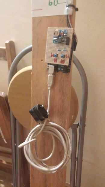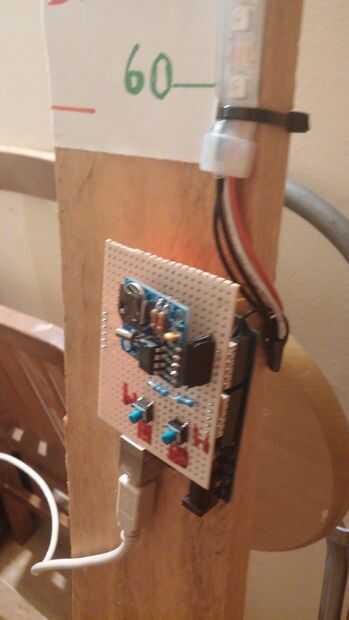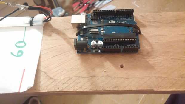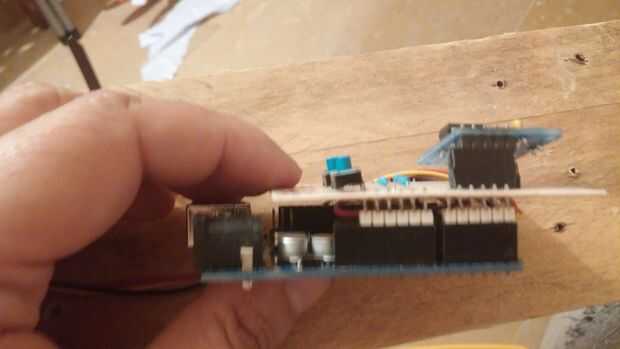 Conectado el Arduino a la pieza de madera con un lazo de plástico.