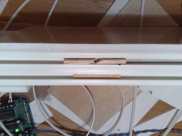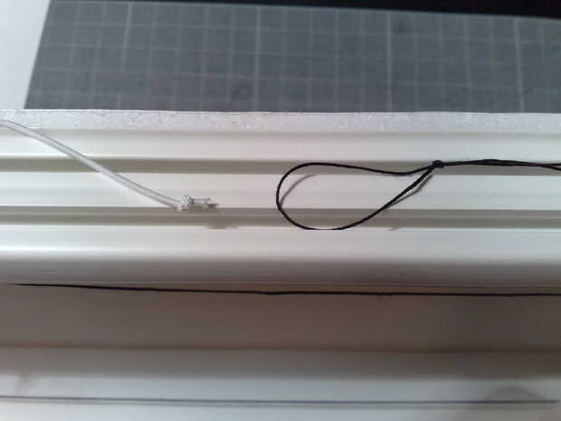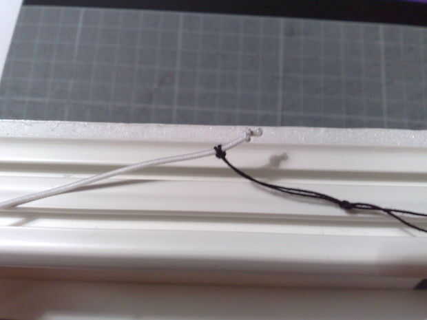 Para compensar esta variación (que no es grande, pero lo suficientemente grande para causar un problema), se unen los dos lados del bucle de hilo con un pedazo de elástico. Esto pone la suficiente tensión en el hilo que lo mantenga en la ranura mientras que es de lo más flojo y tiene suficiente para tomar la tensión cuando está apretado.