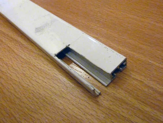 Aserrado un carril de cortina de aluminio de 2 metros en dos pedazos a utilizar para esta versión. Pensé que el metal sería más estable, dada la longitud más larga. En la práctica, no hace una diferencia significativa. La superficie pintada fue más suave y más difícil, así que hay menos fricción, pero hay partes que no están pintadas, y la transición entre las dos zonas es áspero y un dolor adecuado para tratar de y archivo liso. No estoy seguro hay mucho beneficio para con el metal, especialmente si va a ser cerrado de todos modos.