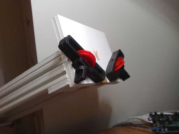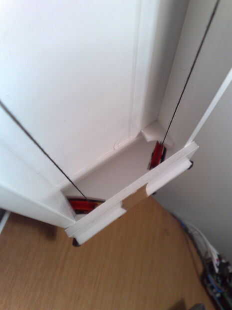 El ángulo en que tengo estas poleas polea pequeña no es nada especial. Parece tener los bucles de hilo que viajan a través de ambos canales en el riel, uno arriba y uno abajo. Bueno, sería bueno, tienes razón, pero también va a ser un dolor y no es ninguna ventaja adquirida.