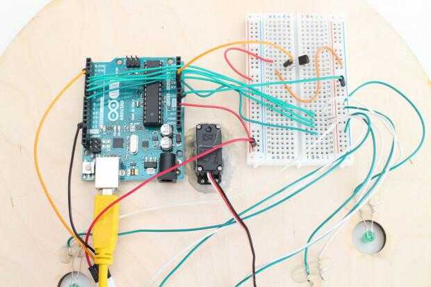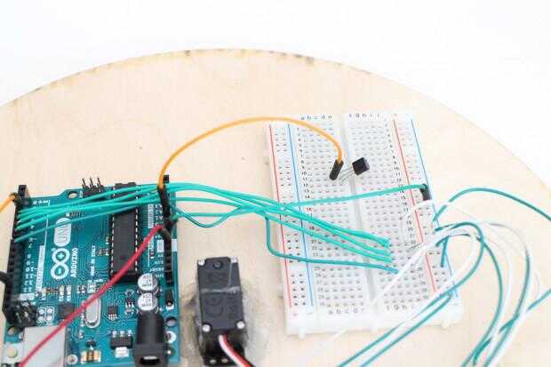 Luego vas a agregar alimentación y tierra al sensor. Esto requerirá una ligera modificación en el circuito del servo motor. En lugar de enchufar en el poder del servo en el pin de 5V de Arduino, ejecute un cable de alimentación de 5V a la protoboard y luego conecte el sensor de temperatura y el servo en la misma fila. Si tu circuito es similar a la siguiente estás en el camino correcto.