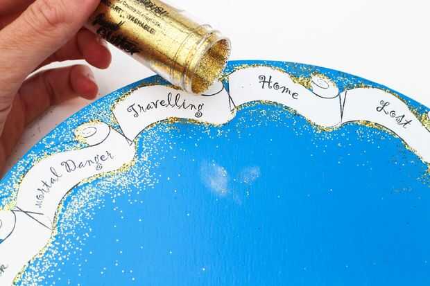 Yo puedo haber conseguido un poco de lujo en esta parte, pero pensé "Sabe usted lo que haría este reloj más mágico... brillo!" Así que corrí gotas de pegamento alrededor de los bordes de las posiciones del reloj y luego había rociado abundante brillo en la parte superior. Una vez que agitas él dejará un bonito borde trémulo alrededor de tus letras.