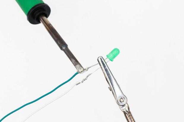 Vamos a tener que extender las patas del LED, por lo que puede conectar fácilmente a nuestra protoboard. Para ello vamos a retorcer juntos y luego conectarlos eléctricamente con soldadura. Comenzar por pelar ambos extremos de los cables con el extractor universal. Luego tuerza los alambres juntos para formar una fuerte cerradura mecánica, debe ser capaz de tirar ligeramente de los cables sin ellos viene aparte. No dude en usar pinzas para ayudar a conseguir unos giros más. Luego uso la plancha y soldar los cables entre sí.