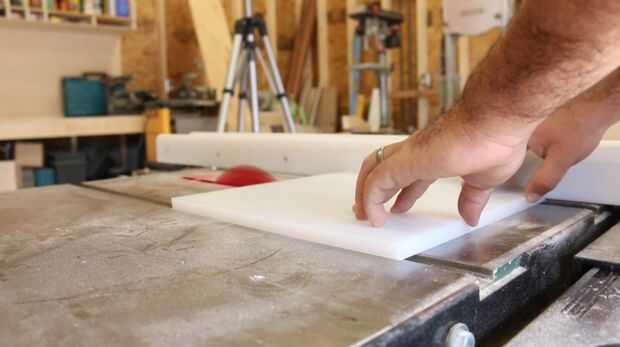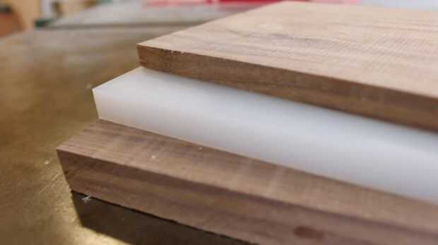 Me arrancó la nuez en la sierra y cortar el plástico UHMW (polietileno de ultra alto peso molecular) a la medida en la Sierra de mesa. Queríamos que tuviera un efecto de capas con 1/2 nuez en el fondo, centro plástico de 1/2" y 1/4 placa superior.