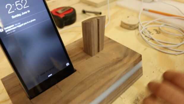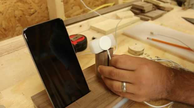 Utilizando el plástico UHMW, cortar una forma de media luna y utilizar una pieza Forstner de hacer un círculo en la cara para mantener el cargador de imán para el reloj de Apple. Cortar una abertura en la parte delantera del reloj soporte para el cable. Se llevó a cabo en lugar con un poco de pegamento.
