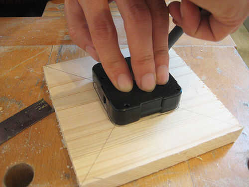 Coloque el mecanismo del reloj en la parte superior la madera, tratando de hacer coincidir el centro de la madera con el centro del mecanismo.