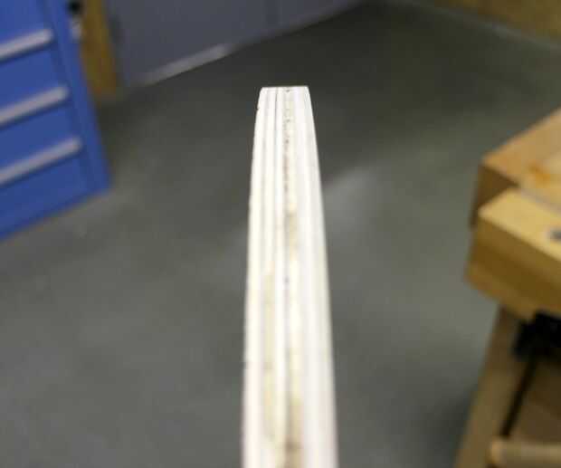 Ahora es el momento para limpiar el borde exterior y conseguir tan suave como sea posible. Utilicé una lijadora de banda para tomar suavemente hacia abajo el borde, en un liso, baja presión, movimiento circular usando los anillos de aferrarse a. Es importante mantener la pieza en un movimiento circular en todo momento cuando esté en contacto con la lijadora, u obtendrá puntos planos y arruinar la forma.
