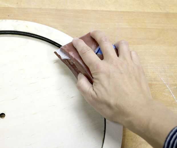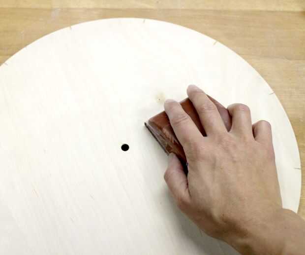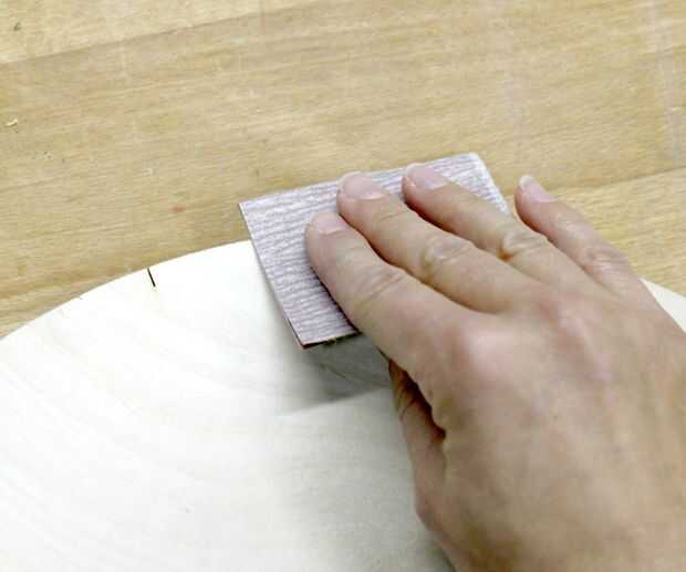 Ahora que el borde está buscando fino, use un pedazo de papel de grano 320 para suavemente y con el grano, suavizar los bordes del círculo. La razón es importante ir con el grano es que la superficie de chapa de madera fina de la madera contrachapada puede fácilmente chip y rasgar si vas contra ella.