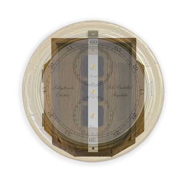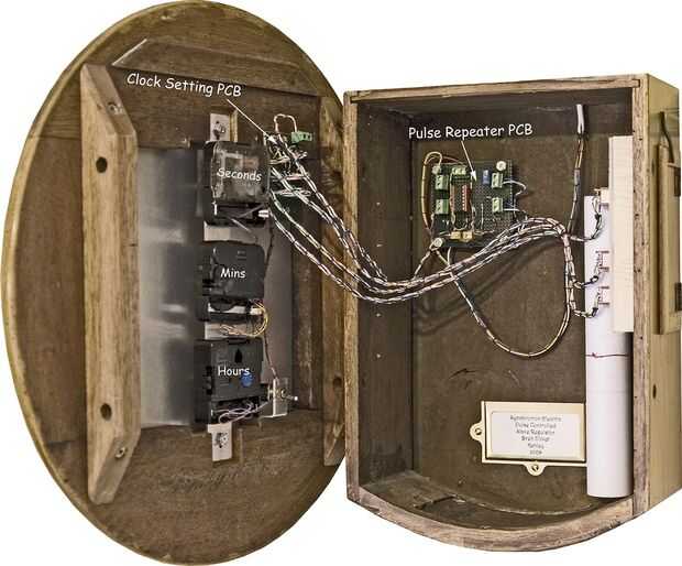 Fig.6 muestra el reloj terminado con la barra de embutido en la esfera envolvente y en este caso pequeños cortes en el recubrimiento del disco para hacer espacio para los módulos de reloj. Tenga en cuenta esta figura se muestra la versión de alta tecnología con interruptores de control y asociados circuitos de cableado. En el reloj de simple no hay necesidad de cualquier cableado o interruptores.