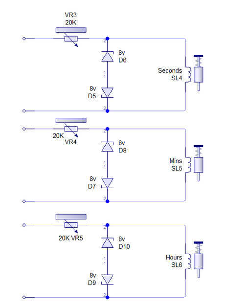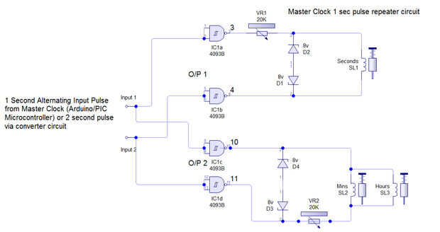 Esto muestra el esquema principal del circuito controlador de reloj. Este circuito convierte una salida de un microcontrolador Arduino o PIC (solamente 2 pernos necesarios) o un 2 segundo pulso vía el circuito convertidor y discos los movimientos del 3 reloj. Resistores variables de ajustan de la corriente por las bobinas de paseo. Las resistencias se ajustan mediante la observación del sonido y retroceso de un adjunto de segunda mano.