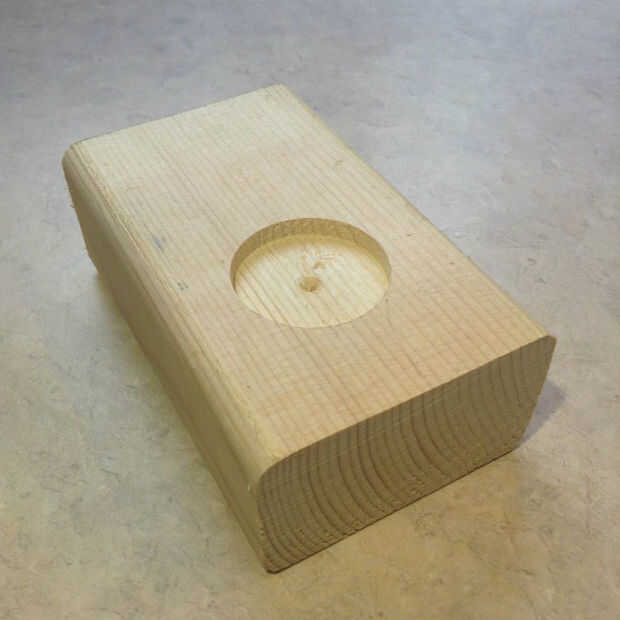 A continuación, necesitará perforar un agujero del mismo diámetro como su pieza de reloj en su bloque de madera. Para ello deberá medir el diámetro de la pieza del reloj y luego una broca forstner con el mismo diámetro. Una vez haya encontrado la broca correcta, usted necesitará hacer un agujero un poco debajo del centro del bloque. La profundidad del hoyo debe ser equivalente a la altura de la pieza de reloj redondo.