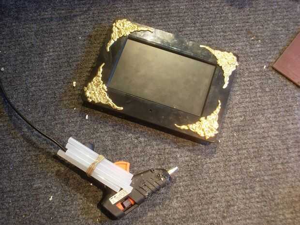 En primer lugar, saqué el mecanismo del reloj reloj de cara y cuarzo. Esta izquierda un reloj vacío con una puerta de cristal bonito, perfecto para la visualización de placas de circuito impreso que tenían en mano. Hubo algunas decoraciones de esquina color oro agradable alrededor de la cara analógica. Me los quité y se colocar la pantalla perfectamente. Un montón de pegamento caliente era necesaria para este proyecto!