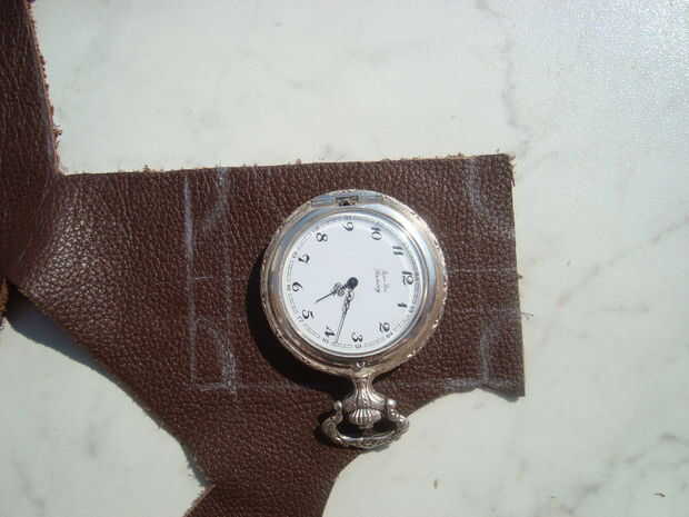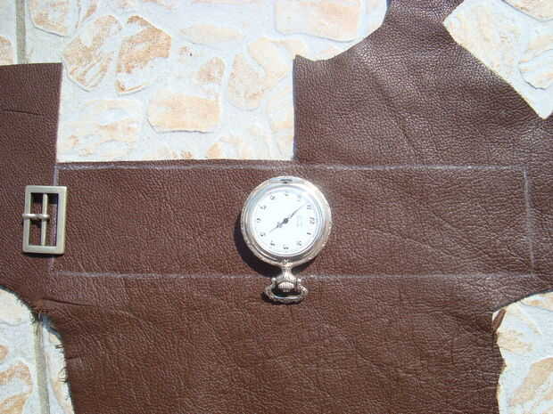 2. el tiempo duro es ahora: cortar un rectángulo más pequeño que será el "bolsillo" countaining el reloj. Debe ser mayor que el reloj por menos de la longitud 2 cm. Puede hacer una prueba con un pañuelo y agregar el reloj para comprobar si se adaptará.