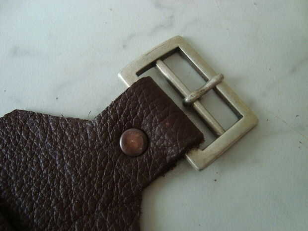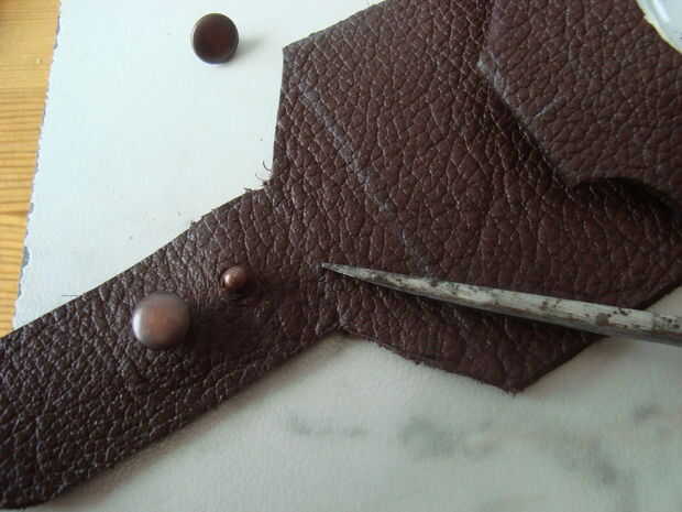 2. bien, puede Agregar la hebilla a la correa rectangular: pasar el cuero que se seleccione el espacio y marcan el lugar donde será punto de bucle (a diferencia del ejemplo). Use el punzón para perforar el cuero, coloque la hebilla, luego, con mucho cuidado, clavar el cuero superior a (el extremo de la tira) al cuerpo.