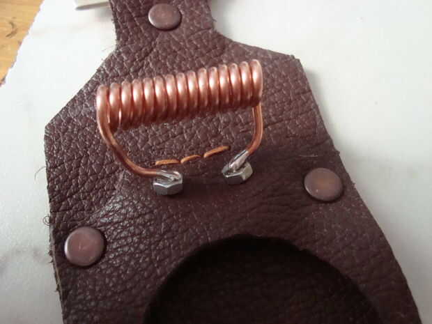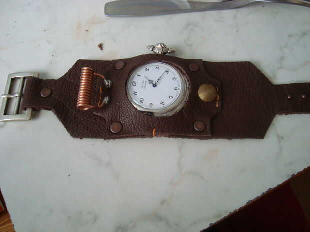 5. cuando su hecho, tomar su reloj y colocarlo entre el cuerpo y el bolsillo. Atornille la cabeza roscada a través de las dos piezas de cuero.