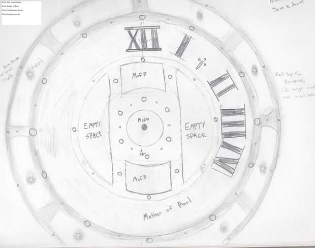 He incluido un bosquejo áspero de mis planes para el reloj. Después de escanear mi dibujo, he añadido algunas breves directrices sobre cómo se montará la cara. Tenga en cuenta que utilizar abreviaturas en mis dibujos.