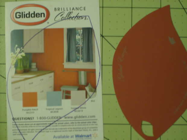 Simplemente trazar la forma de la hoja (Publicada más abajo, en caso de que no está en tu Home Depot / Walmart / Lowes) en las muestras de pintura existente, teniendo cuidado de evitar y cortar alrededor de las etiquetas.