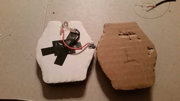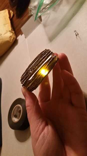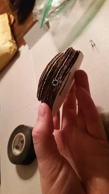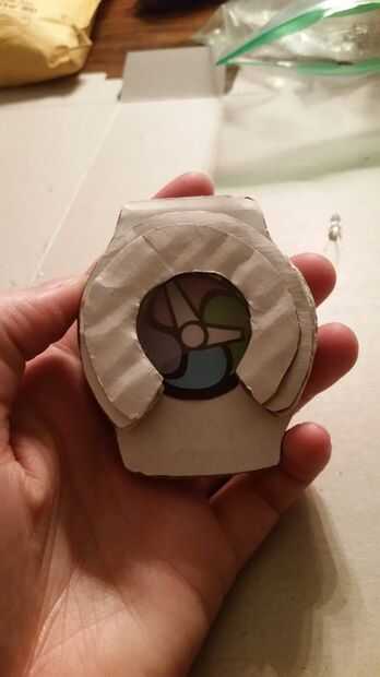 Pruebe el ajuste con las abolladuras. Cuando estés satisfecho, caliente pegamento el las dos mitades juntas.