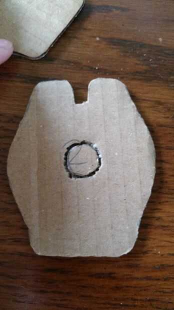 Tome los 2 trozos de cartón con las muescas cortadas fuera de ellos. Seguimiento de la pila en el centro de una. Corte el círculo con un cuchillo del exacto. Alinee esta pieza con la otra pieza dentada y localizar el orificio para asegurarse de que los orificios queden alineados derecha. Cortar el agujero de la segunda pieza.