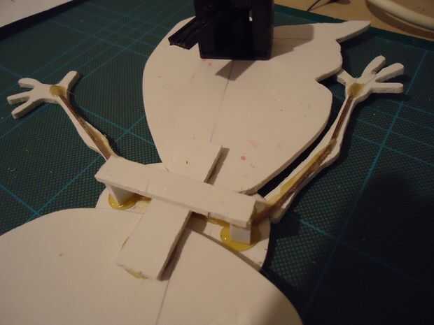 Básicamente es un prototipo, utilizo una pistola de pegamento caliente del derretimiento al montar las piezas. Durante la compilación de la Olaf, compré una nueva pistola de Bosch que fue detonante funcionada, mucho mejor y precisa de lo que mi vieja escopeta que requiere una presión constante en el palillo del pegamento. La ventaja del pegamento caliente del derretimiento es que llena las lagunas, establece rápidamente y se pueden pegar materiales distintos.