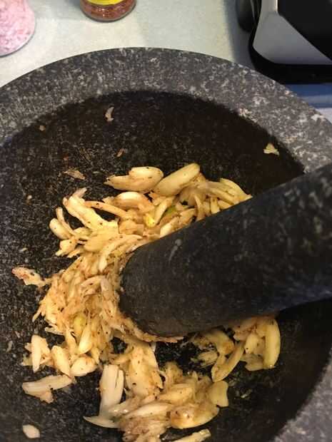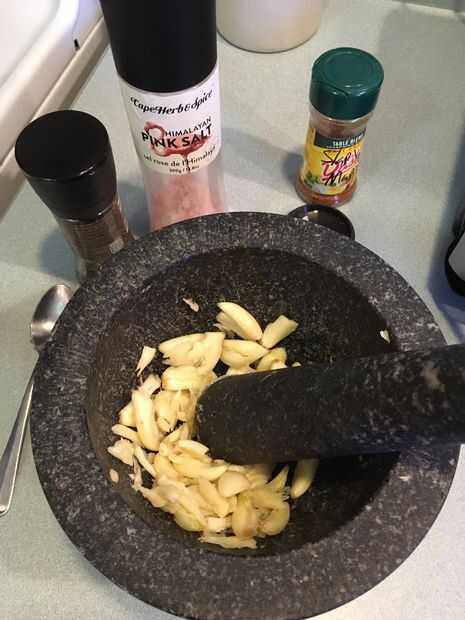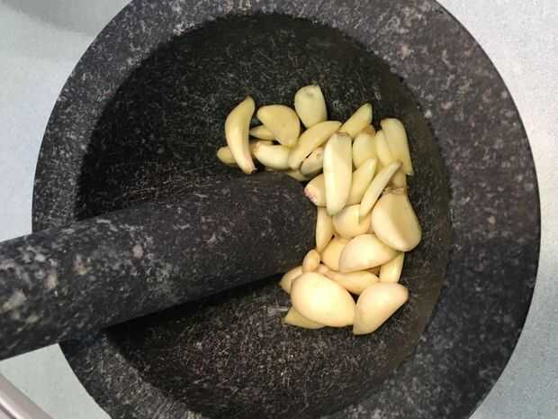 2. Machacar el ajo en un mortal y la maja, agregar sal y pimienta
