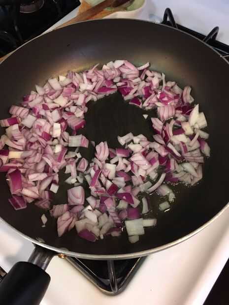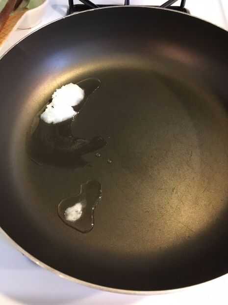 1. Calentar una sartén en med/Hi con una cucharada de aceite de coco (no medir pero es probablemente de 2 cucharas de mesa)