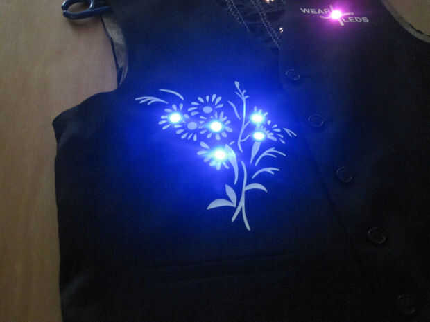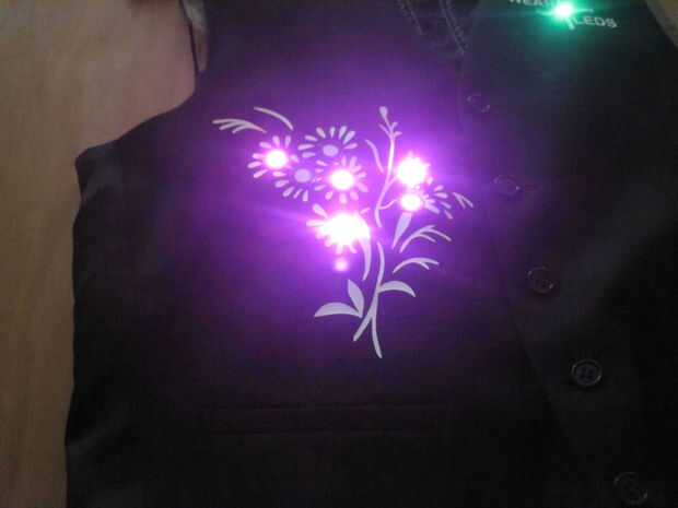 Añada un paquete de baterías para el suministro de energía móvil (un refuerzo de LiPo de 5V o tres 1.5V pilas en una fila) y disfrutar de su nueva ropa brillante.
