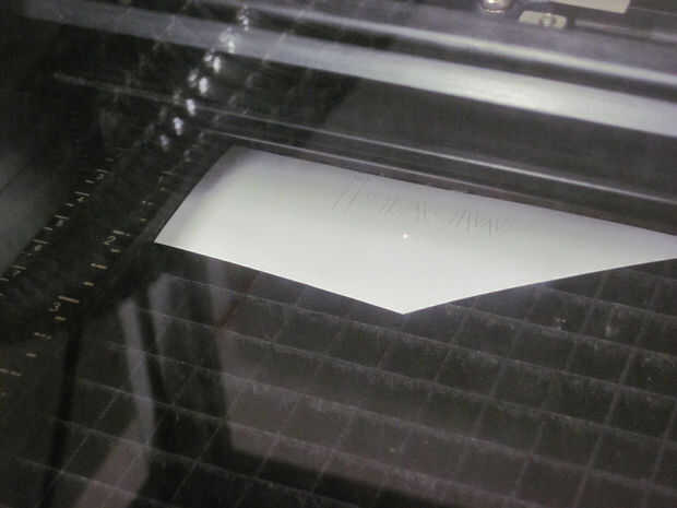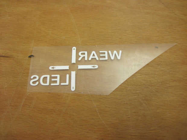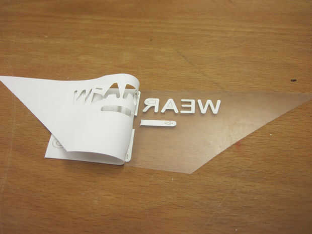 Utiliza una lasercutter para cortar el motivo de un poli-fley hoja. El motivo tiene que ser cortado fuera espejado (algo que siempre olvidamos en la primera carrera), y la lámina transparente debe permanecer uncutted. Con el epilog zing 30W lasercutter usé 7% de potencia, 100% de velocidad y frecuencia 5000.