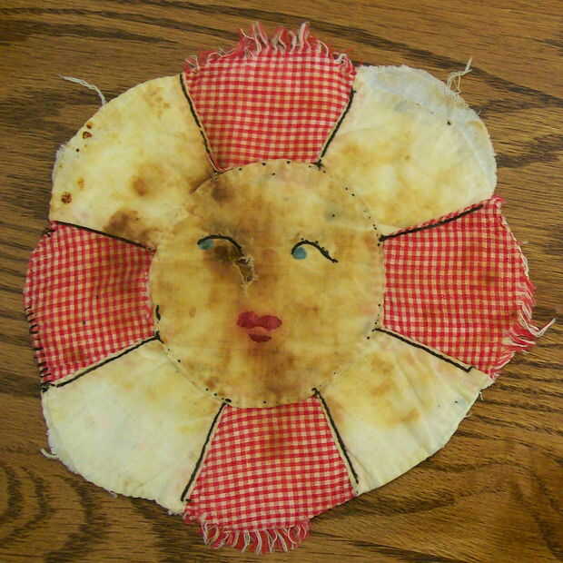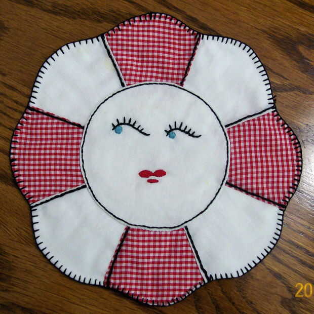7. finalmente había cosido a puntada de carnicero a lo largo del borde exterior y había bordado la cara para el toque final.
