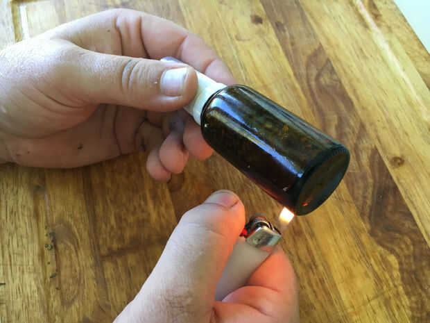 A continuación se que desea calentar suavemente la botella. Hacer esto con cuidado, calefacción sólo por un corto tiempo y luego retirar del fuego, y luego repitiendo. Vidrio está bajo tensión y calefacción a un lado de la botella hará que se rompa. Gire la botella y el calor sólo para 5 segundo intervalos repetidamente hasta que es demasiado caliente al tacto. Agite en el medio.