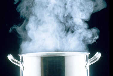 Sin añadir agua, poner la mezcla en una olla grande, a temperatura media.  Cocinar a fuego lento hasta que alcance el punto de ebullición y retirar del fuego.