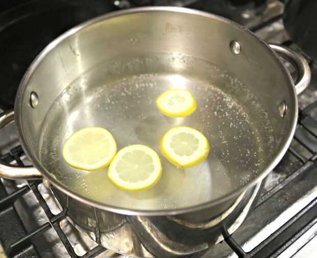 Si no tienes un humidificador, puede utilizar la técnica "del viejo mundo" que solo es agua hirviendo sobre la estufa. El vapor que se desprende del agua es el mismo que el vapor que desprenden desde una máquina de humidificador. He añadido algunas rodajas de limón al agua hirvienda para un agradable aroma fresco.