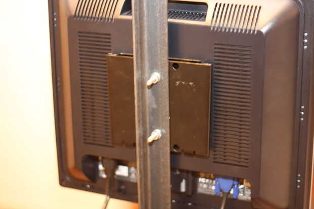 Hice una búsqueda y encontrar algunos diseños pero he encontrado que son un poco rudimentario, complicadas, o que requiere un costoso montaje o brazo. Me di cuenta de una configuración simple utilizando un montaje VESA barato y una pieza de hierro de ángulo.