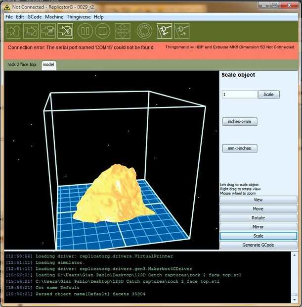 Escala el objeto escribiendo números en el cuadro de diálogo escala. No escala arrastrando - ReplicatorG realmente escalas con una mayor precisión que se muestra en el cuadro de diálogo, por lo que no se conoce el valor exacto si solo arrastra. Deberá introducir un número exacto, para que pueda utilizar el mismo valor para la otra parte de la roca.