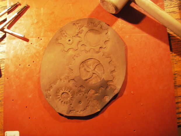 Toque el beveler con el mazo para aplanar la piel alrededor de las piezas que desea que "pop".  La parte profunda de la beveler debe estar tocando el corte.   Deslice el beveler mientras se golpea ligeramente para obtener un borde liso.