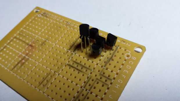 Añadir otro transistor npn a la columna E en fila 7, 8 y 9 hacia la derecha. 7e a 7d, 6e a 6d, 8e a 8D de la soldadura.
