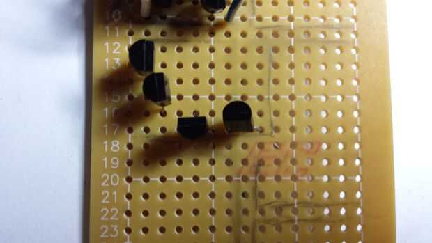 Ahora, agregue dos más npn. La primera está en la fila 17 y las columnas d, e, f hacia arriba hacia el comparador de disparo. El segundo es también en la fila 17 y columna g, h, I mirando hacia abajo en la dirección opuesta del comparador de disparo de.