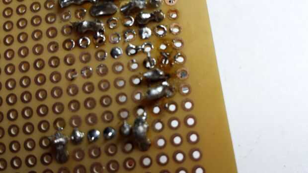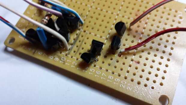 Ahora agregar un transistor pnp a la columna C en hileras 13, 14, 15, frente a la derecha. Soldadura 15b a 15c y 14b y 14c.