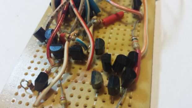 Añadir ahora el transistor pnp final del circuito, irá en la columna j y en filas de 14, 15, 16.