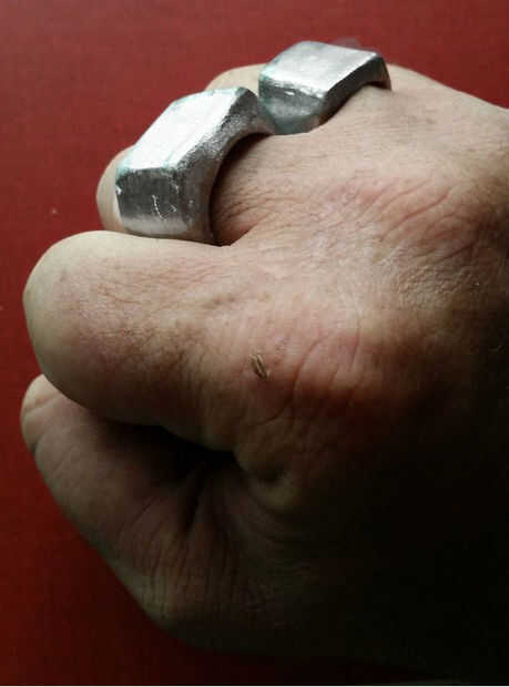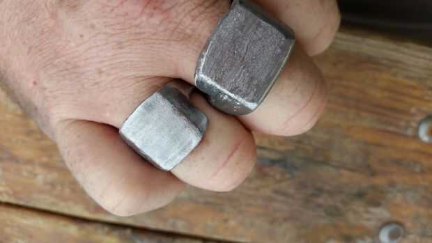 En Resumen, acabé haciendo dos anillos pesados de tuercas hexagonales de acero inoxidable. Les formé para que pueden ser usados en los dedos adyacentes al mismo tiempo. ¿Awesome, derecho? Así que aquí está lo que hacen: en primer lugar, vaya a su ferretería Ace y empezar a probar diferentes tuercas de los dedos hasta que encuentre uno que casi ajuste. Supongo que si encuentras uno que se adapta perfectamente, que es grande. De lo contrario, usted tendrá que moler el agujero hacia fuera un poco, que no es ninguna comida campestre.