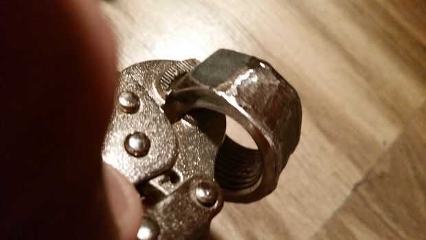 Que intercambian una rueda abrasiva de la rueda de corte y se puso a trabajar el redondeo de las esquinas poco. Por un tiempo, corría la muela hacia adelante y hacia atrás a través de la "banda" pero no hasta el borde. Usted puede ver cómo esto labios alrededor del anillo. Me gustó mucho el look, pero terminé despegando por razones que serán evidentes. Como se puede ver, todavía utilizaba vice grips en este punto. No fue hasta más tarde que tengo smart y apisona el aro en un palo afilado. Resultó para ser la manera más fácil y me permitió a girar lentamente el anillo en torno-como manera, conseguir una circunferencia uniforme.