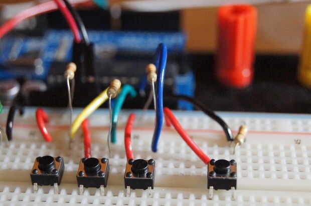 Se colocan los interruptores táctiles a través de la brecha de la protoboard. Un lado del interruptor está ligado en el riel de 5V, el otro va a los pines analógicos, A0-A3 respectivamente, con una resistencia de 330 Ohm atada a tierra.